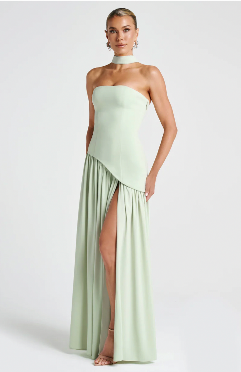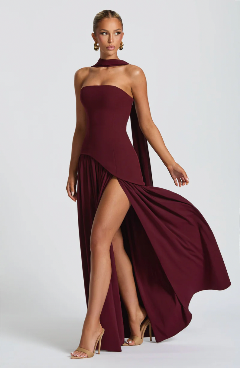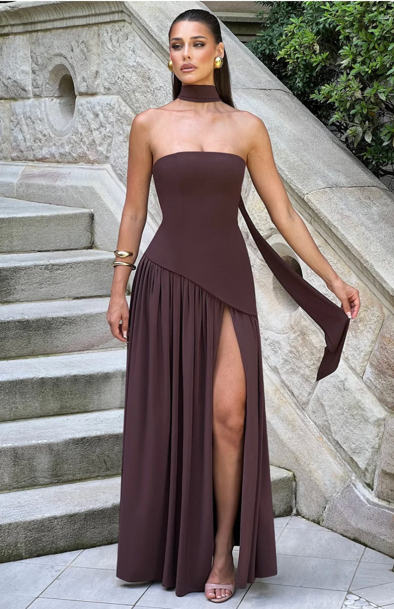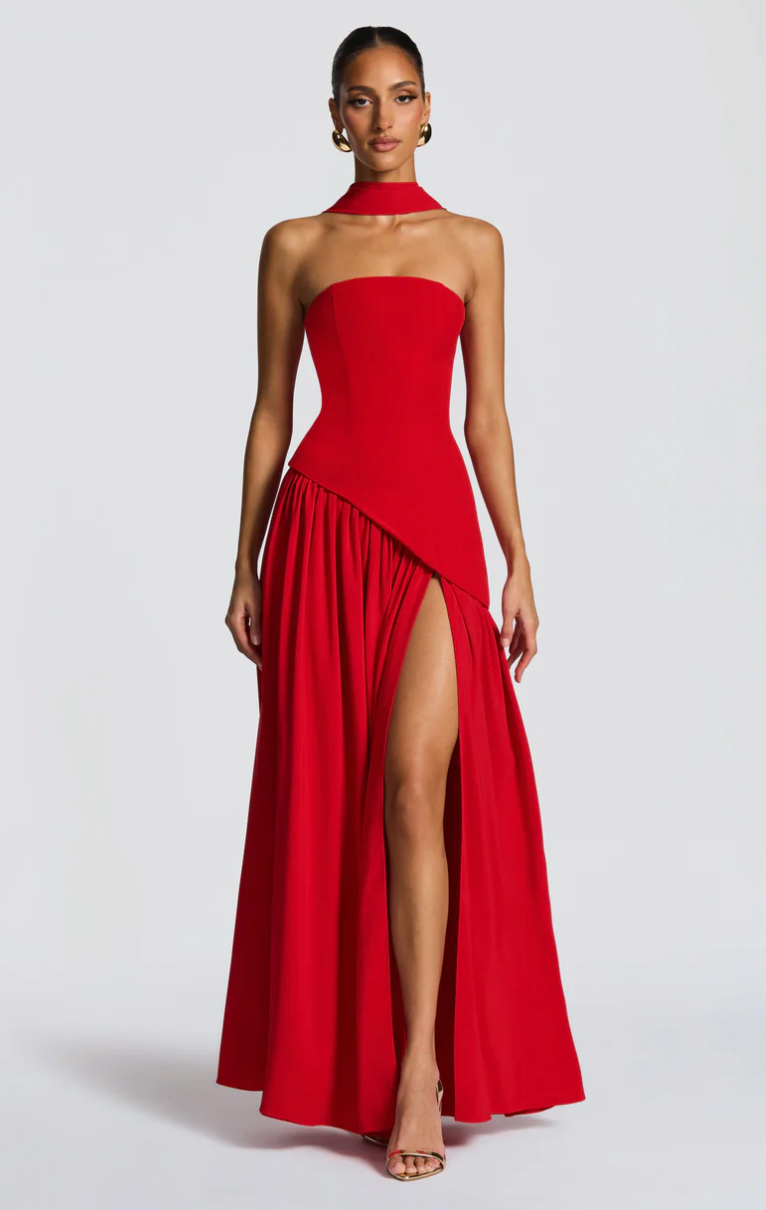 The Maliyah Maxi Dress features a fitted crepe bodice with an asymmetrical hem and lace-up back, paired with a flowing chiffon skirt. Its full, gathered design includes a thigh-high split, blending elegance with a modern edge.