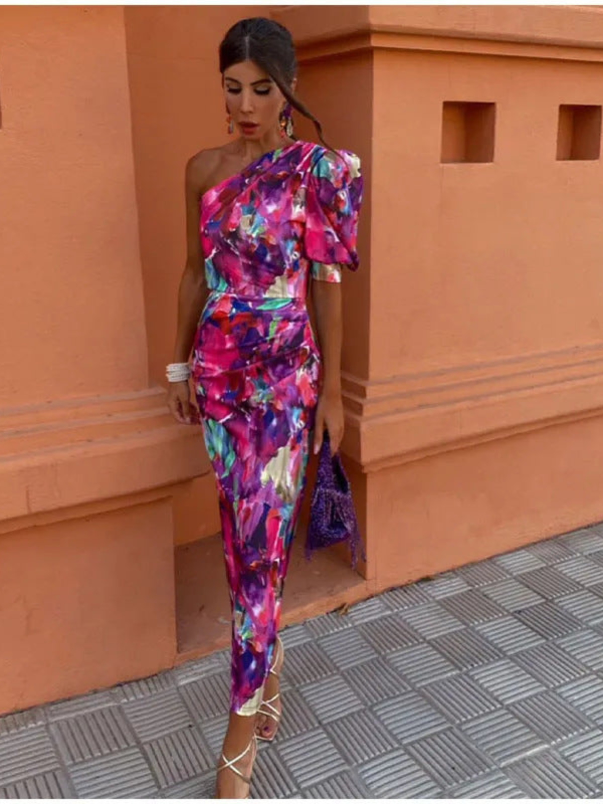 • Unforgettable one-shoulder silhouette in vibrant shades of purple